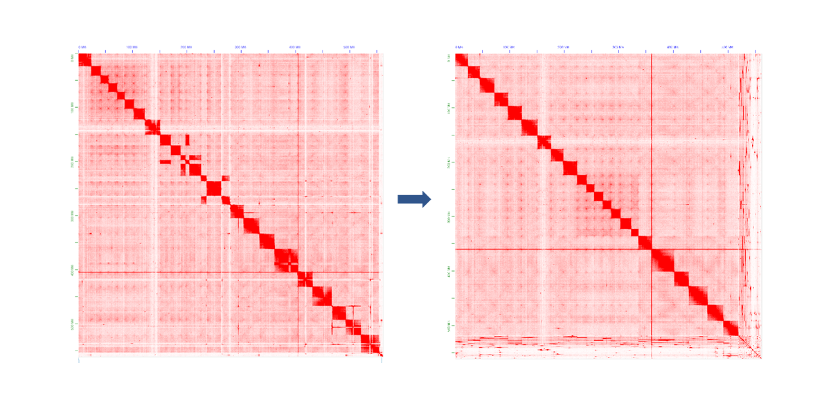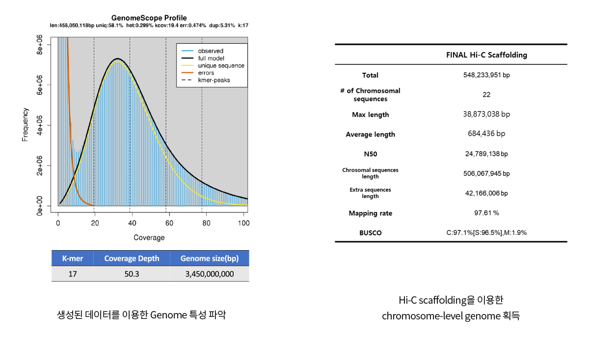 long-read 기반의 Nanopore sequencing 기술과 short-read 기반의 Illumina sequencing 기술을 병합하여, Hybrid sequencing 기술을 통해 NG50 score와 base-pair quality 두 부문에서 모두 높은 high-quality genome을 제공하고 있습니다.