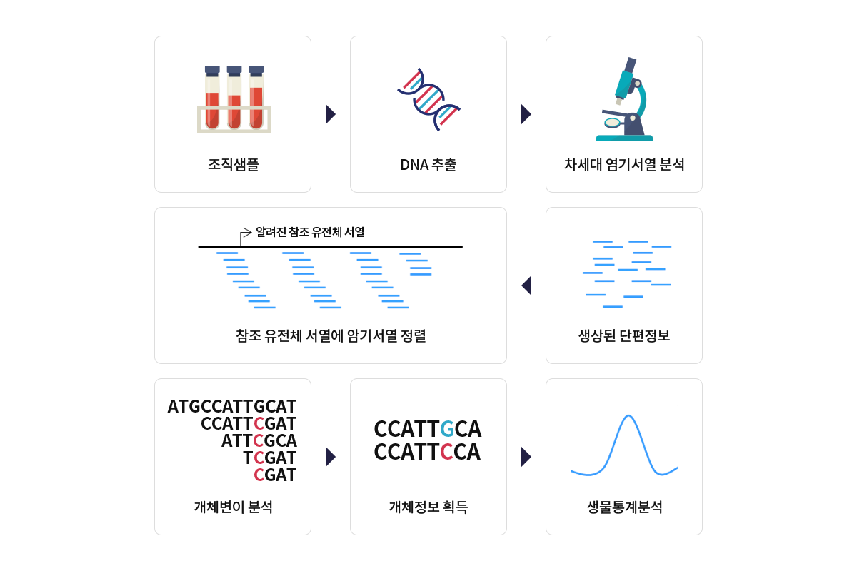 차세대 염기서열 분석 방법 (Next Generation Sequencing)을 통해 생산된 DNA read 정보를 같은 종의 reference genome 에 정렬하고, 이를 통해서 연구대상의 특이적 유전정보를 확인합니다.